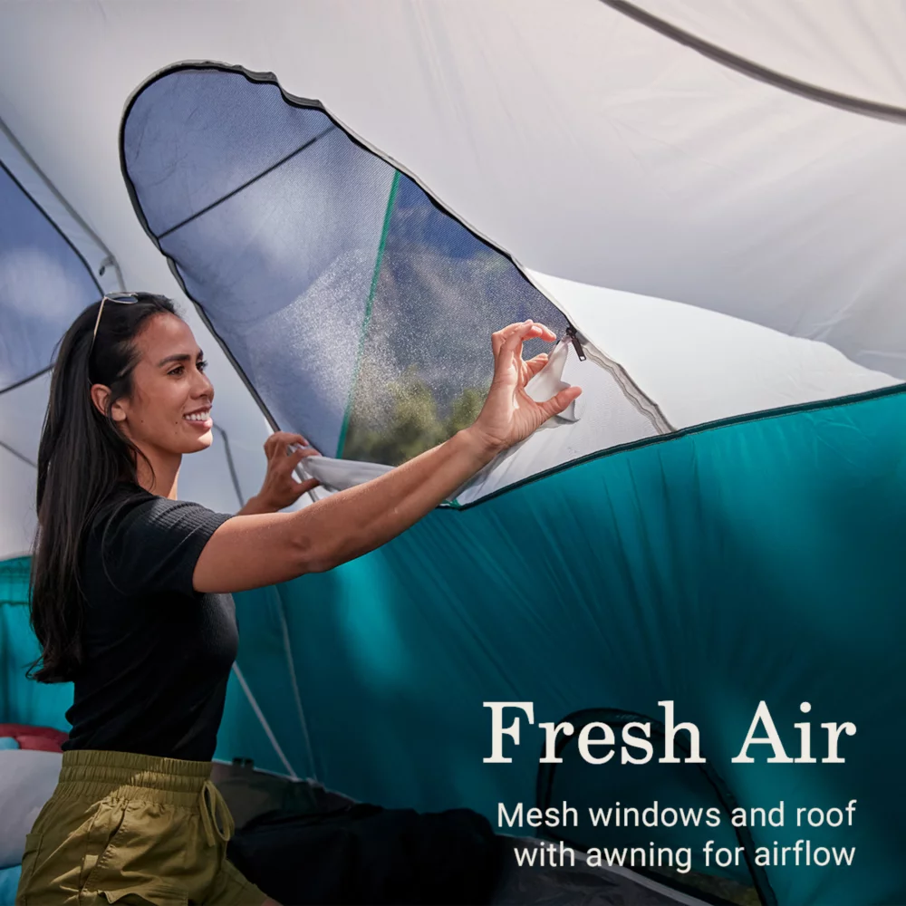 Gather the gang for good times in the great outdoors. Coleman® tents, like our spacious Blue Springs™ II 8-person tent are designed to make it happen. Comfy campers are happy campers, so our Weathertec™ system helps keep water out with a tub-style floor, welded corners, inverted seams, taped seams, and a tough fiberglass frame that’s wind-tested up to 35 mph. When you need a little personal space, a room divider provides extra privacy, and the wide door on this spacious tent makes it easy to get airbeds and other large gear in and out. Easy setup means you relax more and stress less, so this model also boasts snag-free continuous pole sleeves. And you’ll catch every breeze with an advanced ventilation system that includes a mesh roof, rainfly with awning, and a ground vent. This large camping tent measures 17’ x 10‘ x 6’ and is roomy enough to fit 3 queen-size airbeds, meanwhile two gear pockets help keep smaller items from getting lost. Durable polyester body, fiberglass poles, and polyethylene floor. 1-year limited warranty.